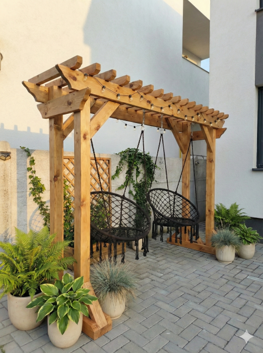 • Design: Structură tip pergolă (grinzi deschise), ideală pentru un aspect aerisit sau pentru a fi decorată cu plante cățărătoare.