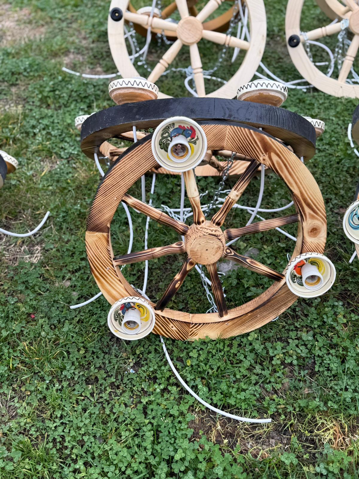 Adu farmecul conacelor de altădată în casa ta cu această lustră artizanală unică, realizată sub forma unei roți de car autentice. Detaliul distinctiv al acestui model este reprezentat de farfuriile decorative montate la baza fiecărui soclu, care completează perfect estetica rustică și oferă un aspect vizual echilibrat și elegant, ideal pentru livinguri, crame sau foișoare primitoare.