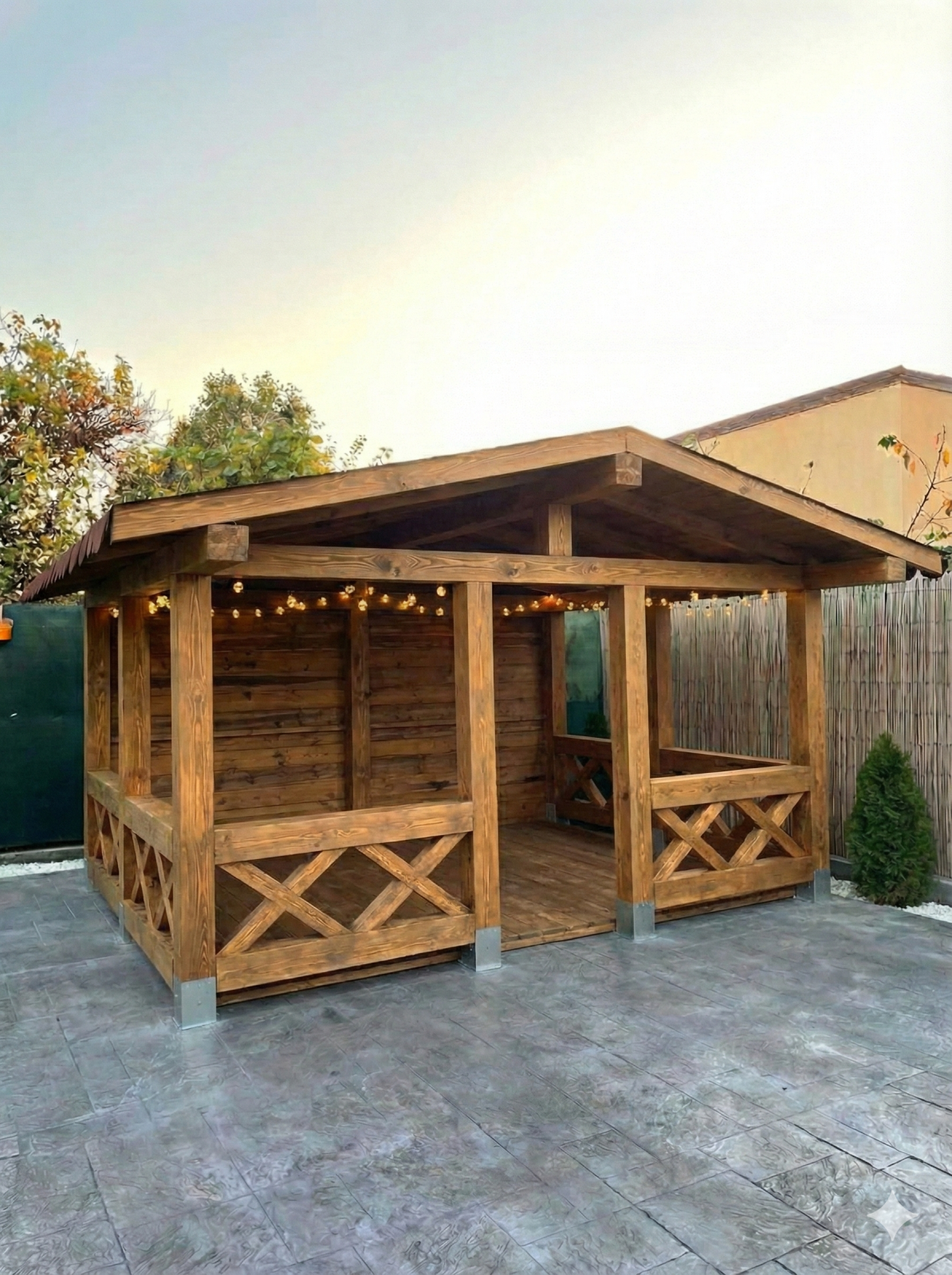 • Acoperiș Complet Finisat: Structura acoperișului este închisă cu lambriu din lemn de 22mm (estetică plăcută vizibilă de jos) și protejată cu șindrilă bituminoasă de calitate.