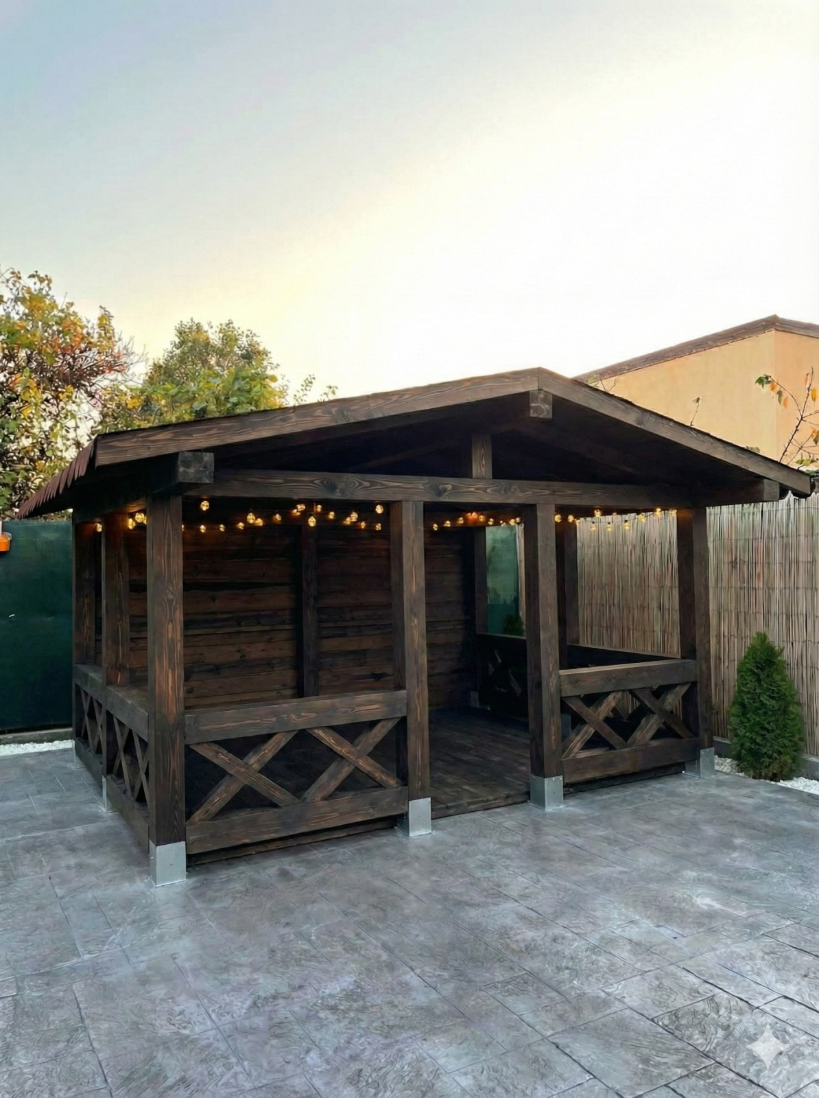 • Acoperiș Complet Finisat: Structura acoperișului este închisă cu lambriu din lemn de 22mm (estetică plăcută vizibilă de jos) și protejată cu șindrilă bituminoasă de calitate.