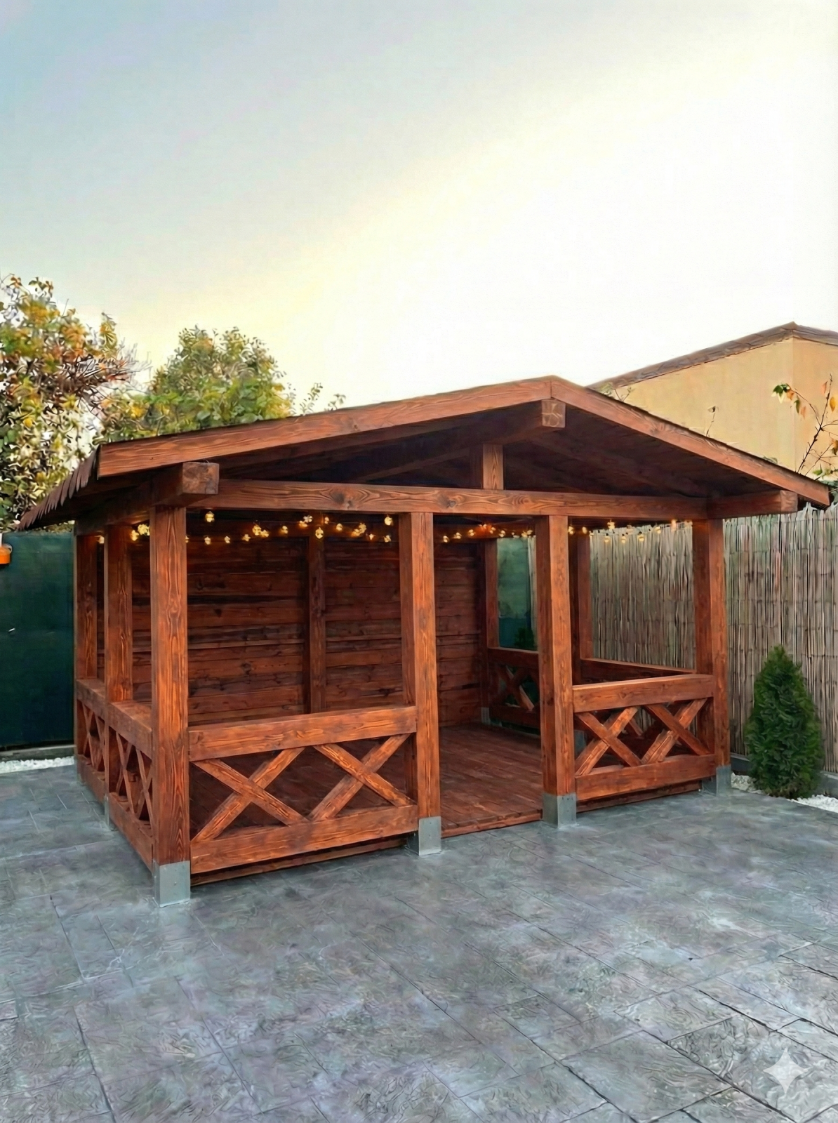 • Acoperiș Complet Finisat: Structura acoperișului este închisă cu lambriu din lemn de 22mm (estetică plăcută vizibilă de jos) și protejată cu șindrilă bituminoasă de calitate.