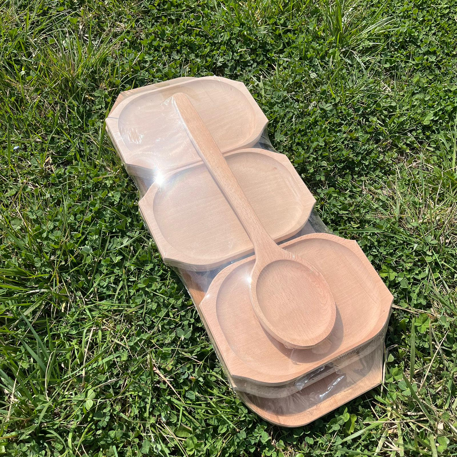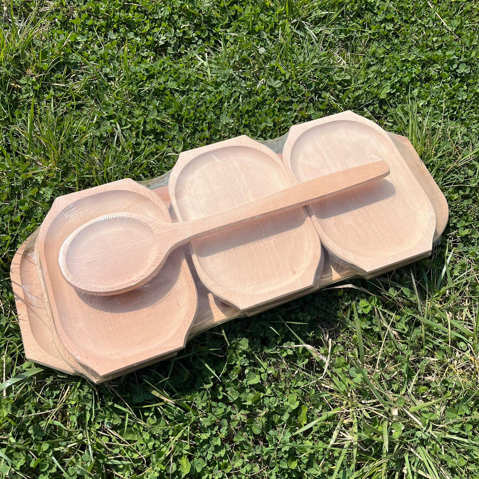 Set Servire Tradițional 8 Piese – Platou Masiv, 6 Farfurii și Lingură de Lemn