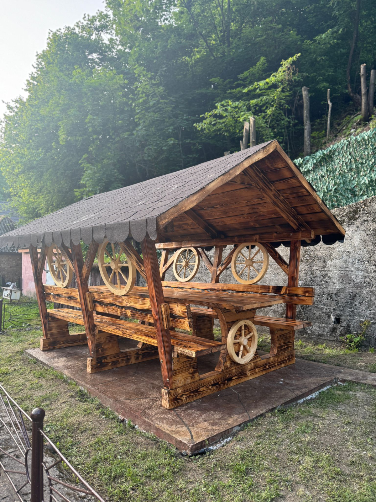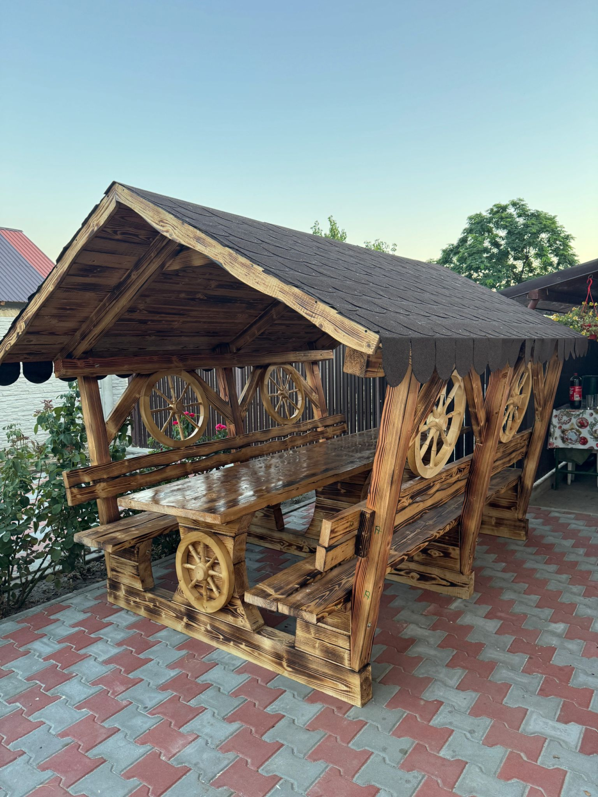 Transformă-ți grădina într-un spațiu de ospăț autentic cu acest foișor rustic impunător. Realizat integral din lemn masiv și decorat cu roți ornamentale tradiționale, acest ansamblu oferă confortul ideal pentru mesele mari în familie sau cu prietenii. Este o piesă de mobilier de grădină durabilă, concepută să devină punctul central al curții tale, oferind protecție și un design deosebit indiferent de anotimp.