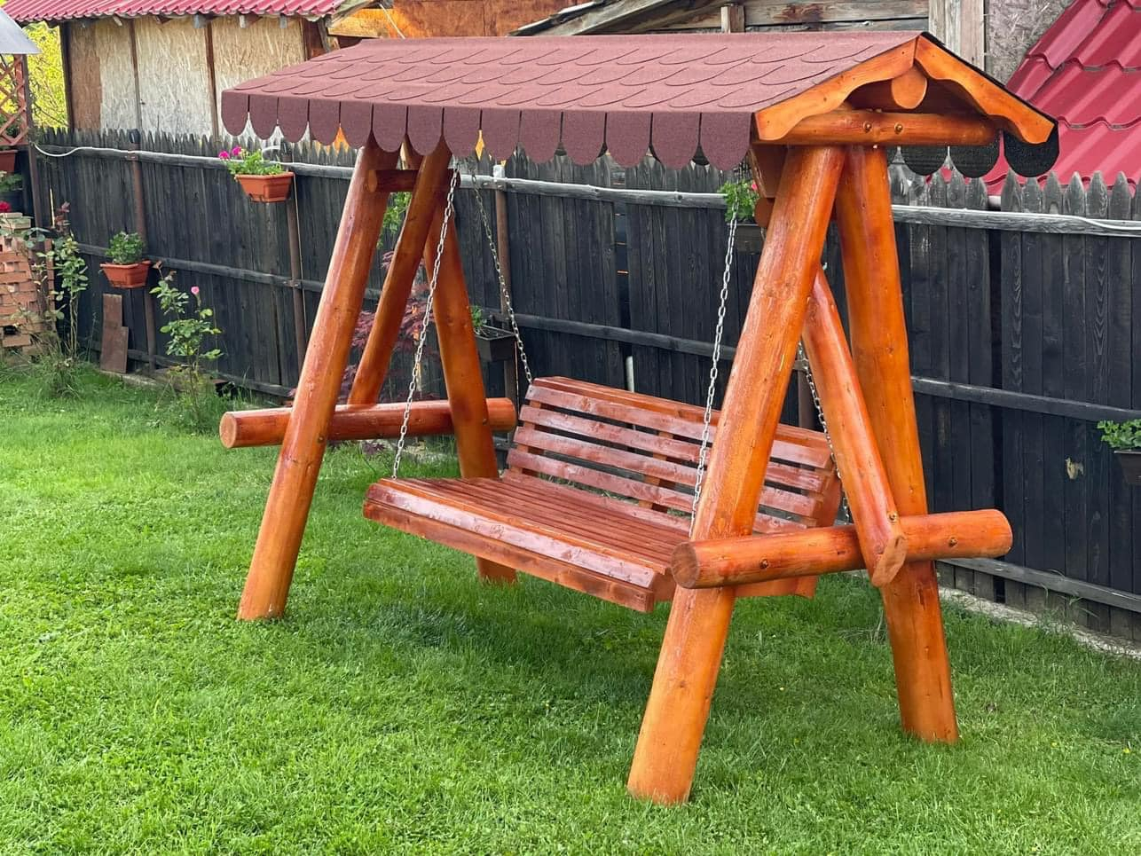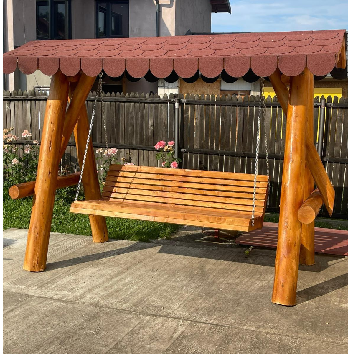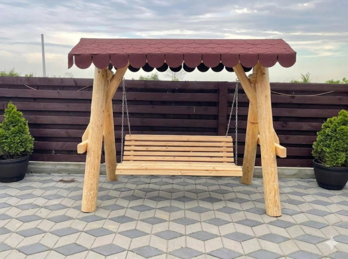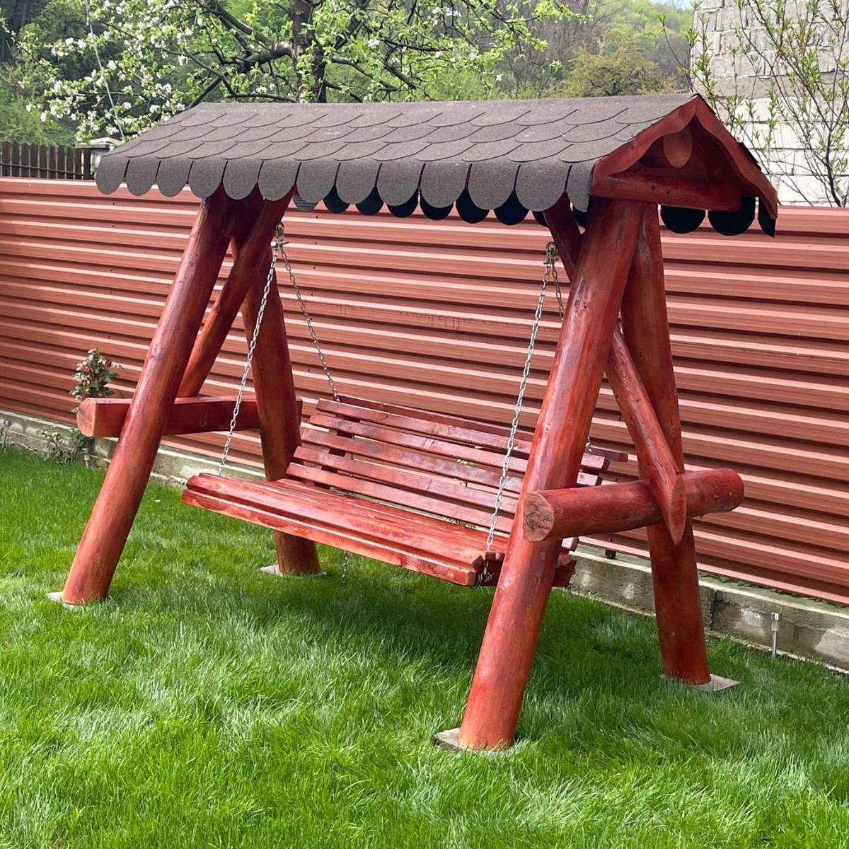 Leagăn din Lemn Masiv cu Acoperiș din Șindrilă Bituminoasă – Relaxare și Durabilitate